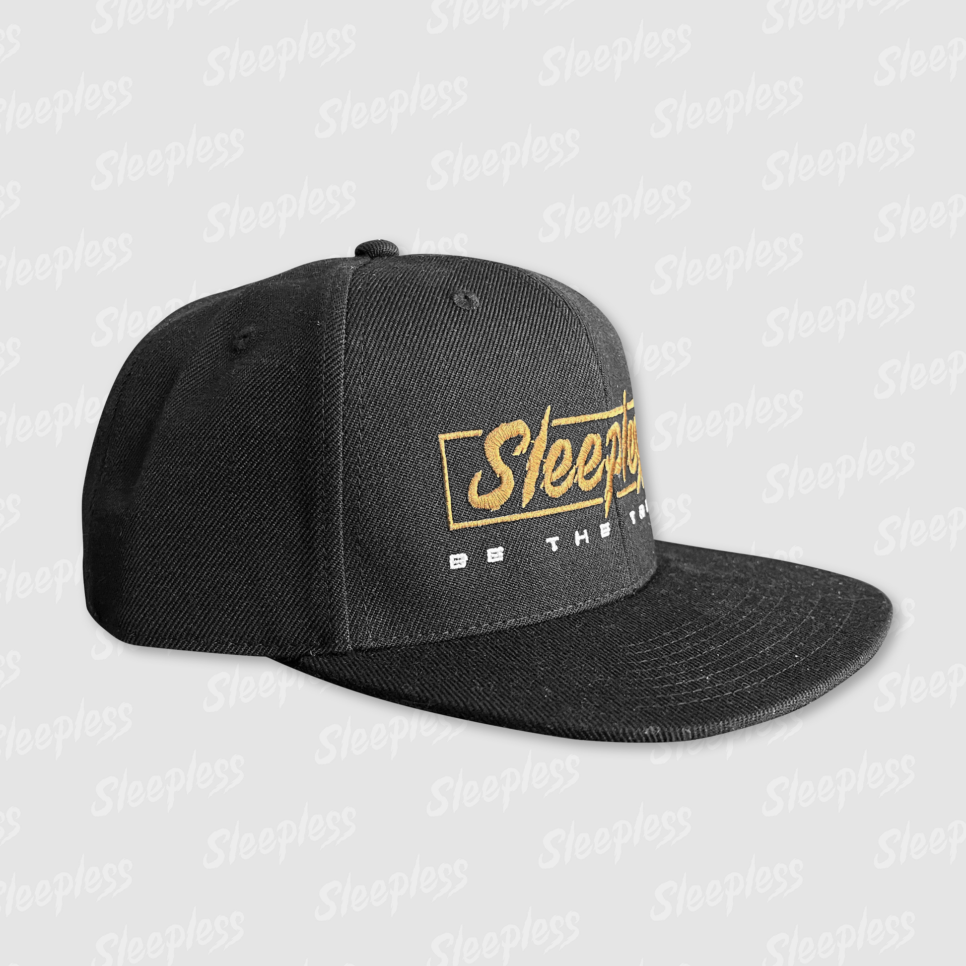 High quality adjustable black snapbacks feature a raised embroidery pattern on the front, side and rear of the hats. Making use of a beautiful gold metallic and white thread for the designs.